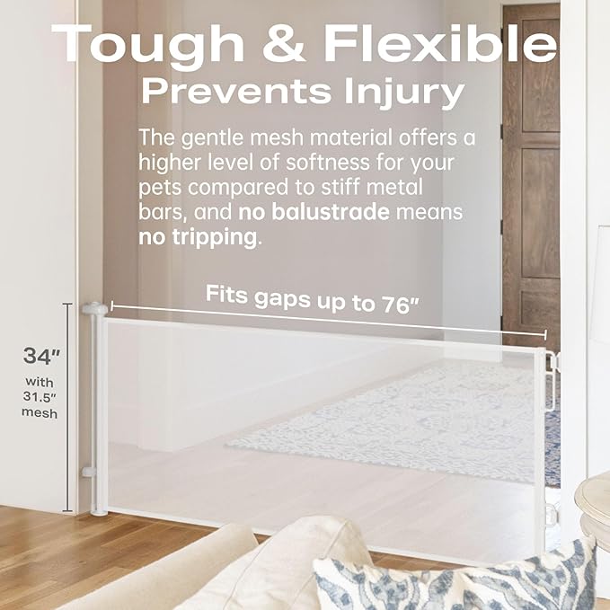 • Expandable Size: Our retractable gate extends up to 76" Extra wide and is 34" tall.The Cumbor mesh dog gate conveniently rolls up when not in use, making it easy to convert the room into an adult-friendly space again
