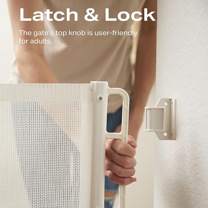• New Safety Locking: The knob at the top of the mesh gate ensures that the retractable pet gate is easy to use for adults and can be opened and closed with one hand, while curious little ones and pets will not be able to make any naughty bids for freedom