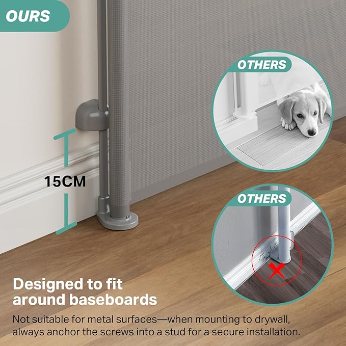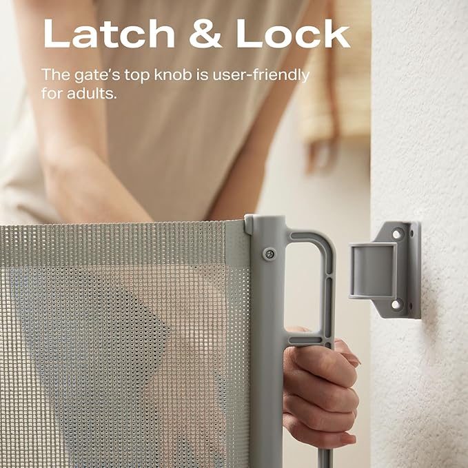• New Safety Locking: The knob at the top of the mesh gate ensures that the retractable pet gate is easy to use for adults and can be opened and closed with one hand, while curious little ones and pets will not be able to make any naughty bids for freedom
