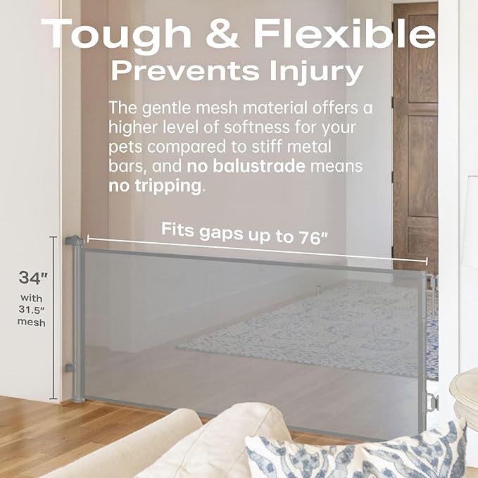 • Expandable Size: Our retractable gate extends up to 76" Extra wide and is 34" tall.The Cumbor mesh dog gate conveniently rolls up when not in use, making it easy to convert the room into an adult-friendly space again