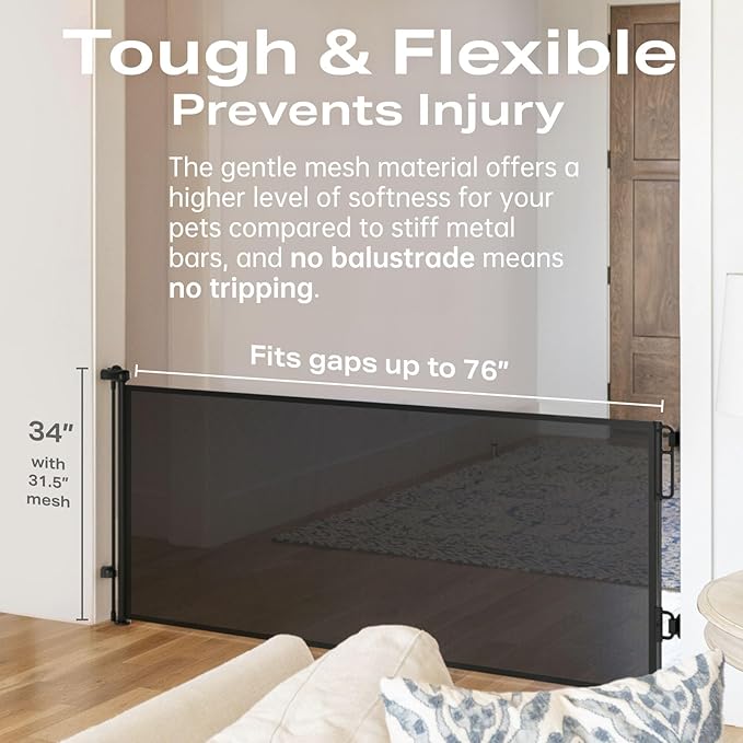 • Expandable Size: Our retractable gate extends up to 76" Extra wide and is 34" tall.The Cumbor mesh dog gate conveniently rolls up when not in use, making it easy to convert the room into an adult-friendly space again