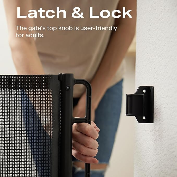 • New Safety Locking: The knob at the top of the mesh gate ensures that the retractable pet gate is easy to use for adults and can be opened and closed with one hand, while curious little ones and pets will not be able to make any naughty bids for freedom
