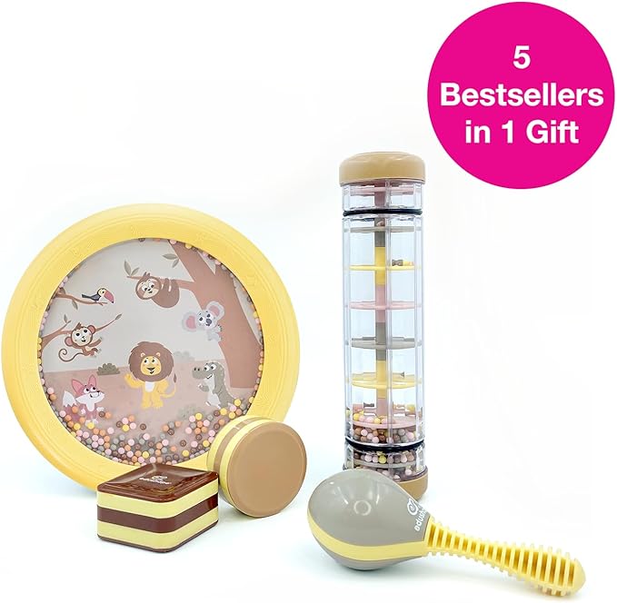 • WHAT'S INSIDE: An 8-inch plastic rainstick rainmaker toy, hand drum, shakers, and maracas music instruments for toddlers in minimalist colors. Music set meeting latest safety standards free from BPA and Phthalates. Suitable for ages 18 months and up.