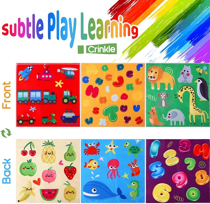 • 【✅Learning Toys Box for baby】Our baby tissue box toy provides 3 multi-themed crinkle papers & 8 colorful silk scarves for 1~3 year old toddlers to play with. It attracts children with vibrant colors and crumpled sound, which will promote their skills of fine motor, distinguish colors, stimulate the development of their hearing and vision, and exercise their early brain enlightenment.