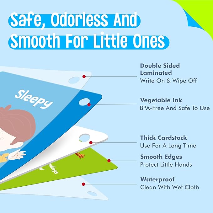 • 50 Different Emotions: The flashcard set has 50 different moods, like happy, sad, surprise, angry, hopeful, embarrassed, scared, frustrated, grumpy and other feelings. It adopts expressive faces of cartoon characters, kids can get and learn the emotion more directly. The image captures the attention of children and makes it easy for them to connect with their feelings.