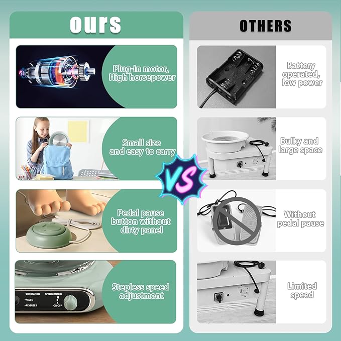 • Safety Material, Friendly Design: The overall pottery wheels use high-quality and safe ABS materials and electronic components. The ABS splash pan sticker design of the pottery wheel can block the splash and clay, and keep the working area clean. The removable ABS splash pan and the turntable are very easy to clean