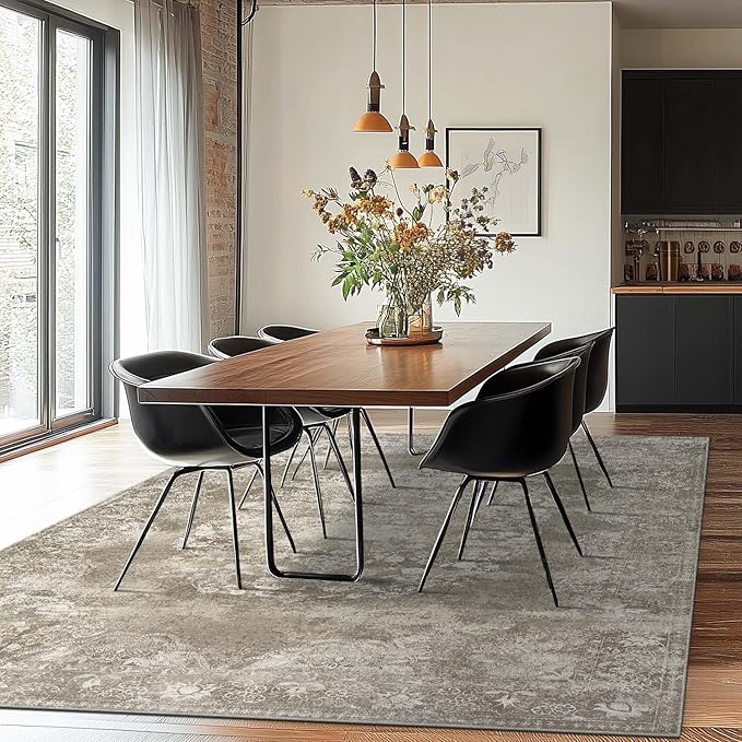 jinchan Washable Area Rug 8x10 for Living Room - Soft Faux Wool Ultra-Thin Stain Resistant Non-Slip Distressed Vintage Floral Large Carpet for Bedroom,Dining Room,Home Office,Nursery(Brown, 8'x10')