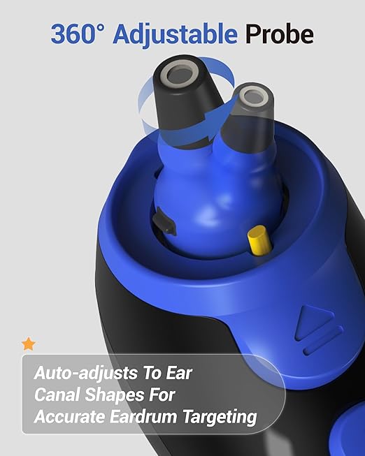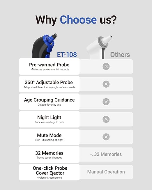 • User Friendly - Features a clearly and large LED display, easy to read even at night with soft backlit; 32 memory recalls track your family's health at any time; ℃ /℉ switchable fits the usage habits of different people. 360Β° floating self-adaption probe ensures optimal alignment with the eardrum while maintaining comfort during use
