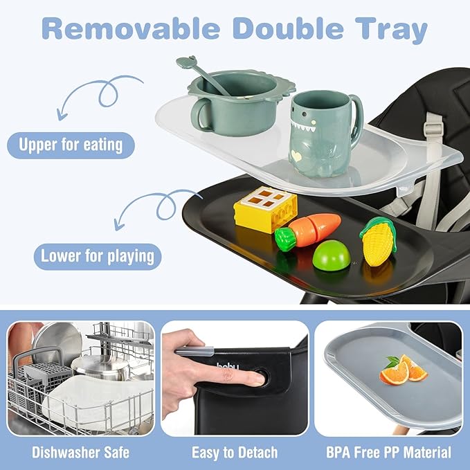 • Removable Double Tray: This infant feeding chair is equipped with a double tray that can be easy to detach according to your needs. The upper tray is suitable for eating and feeding, and the lower tray is ideal for playing. The tray is made of BPA free PP material and harmless to the health of your baby.