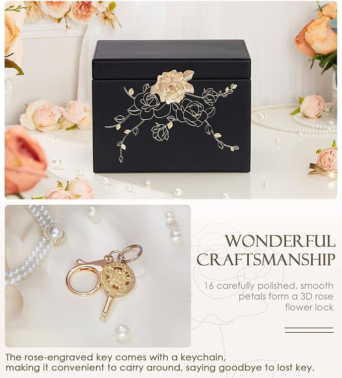 • Leather-Like Design with Lock: The jewelry box's faux leather-inspired design with golden rose accents and a lock ensures both style and security for your treasures.