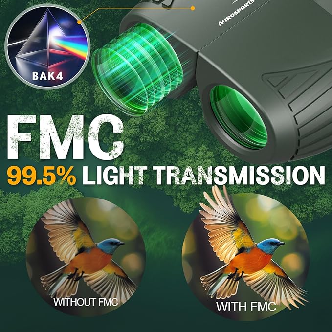 • Fully Multi-Coated 25mm Objective Lens: Our birdwatching binoculars are equipped with FMC (Fully Multi-Coated) lenses, providing exceptional light transmission, color fidelity (99% color restoration), and image sharpness. Say goodbye to distorted images and enjoy a bright and clear view.