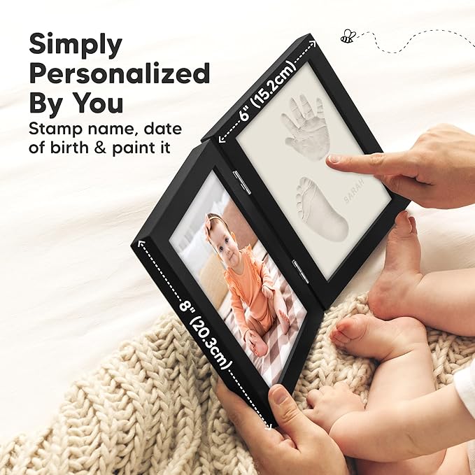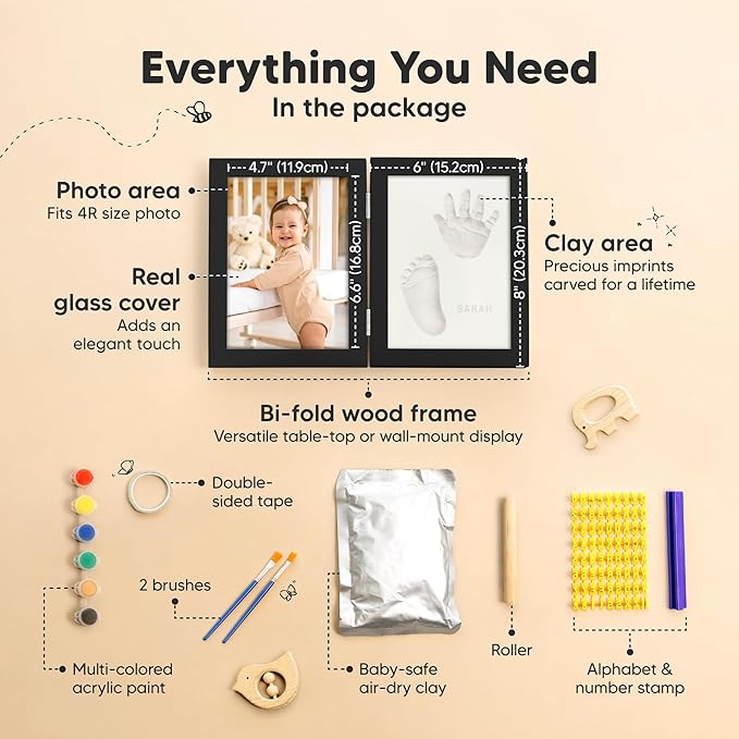 • All-in-one Baby Handprint and Footprint Kit - An elegant bi-fold Rune wooden frame with real glass cover, baby-safe air-dry clay, a wooden roller, alphabet stamps, paint and brush for personalization, and double-sided tape to keep it all in place.