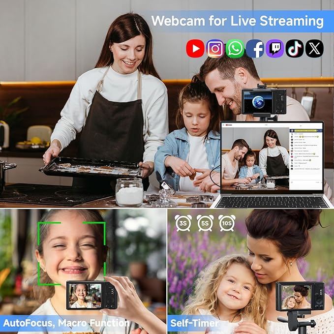• Vlog Webcam and Upgraded Fill Light:The digital camera with video can be used as a live webcam, the pause function allows you to pause while recording. Built in 3 flash bulbs make the illumination brighter, helping you take clear photos even in low light