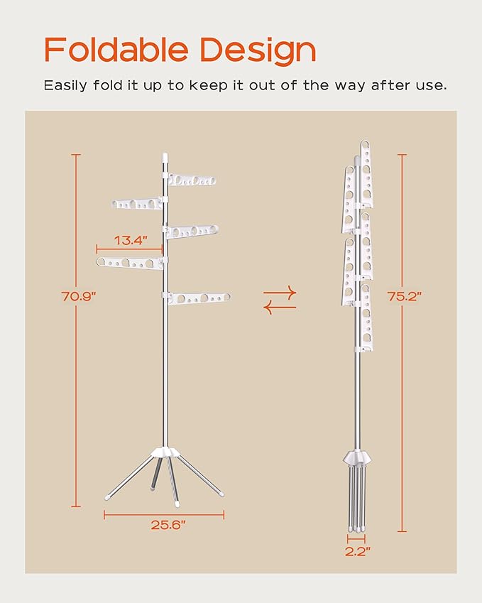 • [Foldable and Space-Saving] This vertical drying rack measures 25.6”D x 25.6”W x 70.9”H and takes up very little space. After use, simply fold the four legs and three drying rods into a smaller size: 2.2 "D x 2.2 "W x 75.2"H, which can be leaned against the footrest, perfect for apartment laundry rooms or narrow spaces and corners.