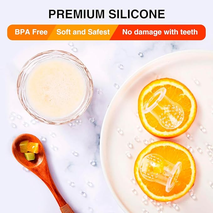 • 【SAFE SILICONE POUCH HOLES】HAOBAOBEI fruit feeder is made from 100% food grade silicone. BPA free. Lead, phthalates, latex free. 2mm silicone pouch hole, the juice is even and not easy to be blocked. When the baby bite the feeder pacifier, the food enters the baby's mouth in the form of fine and digestible drops, which will not choke the baby and avoid the risk of suffocation.