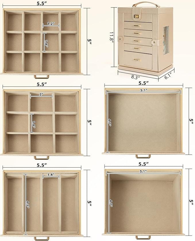 • 【Large Capacity,More Storage Space】With 6 versatile pull out drawers, and additional ring and earring storage at the back,this black huge jewelry box can store a lot of jewelry accessories, such as rings, earrings, necklaces, chains, bracelets and so on. One deeper drawer is designed for watches,sunglasses or large jewelries.
