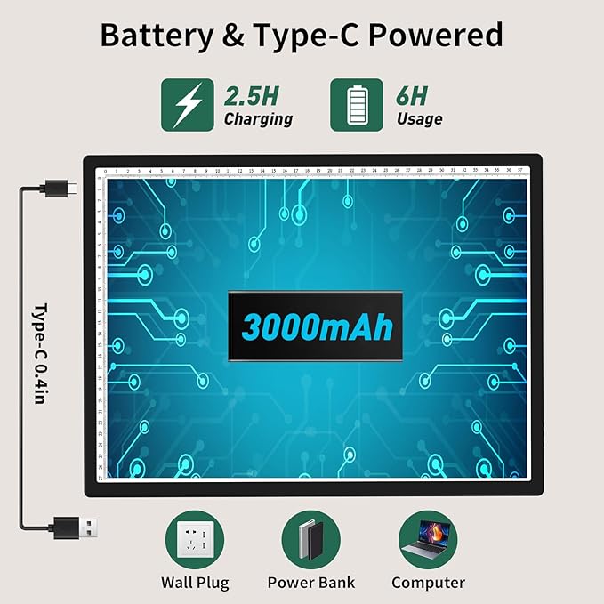 • <๐—•๐—ฎ๐˜๐˜๐—ฒ๐—ฟ๐˜† ๐—ฃ๐—ผ๐˜„๐—ฒ๐—ฟ๐—ฒ๐—ฑ ๐——๐—ฒ๐˜€๐—ถ๐—ด๐—ป>: The cordless light drawing pad boasts a rechargeable battery, delivering up to 4 hours of uninterrupted usage with just a single 2.5-hour charge. This functionality elevates the light pad's mobility, empowering users to engage in work or creativity even in settings devoid of power sources. Its portability renders it perfect for outdoor sketching or scenarios where power outlets are scarce. The absence of cords translates to reduced clutter and heightened convenience in your workspace.