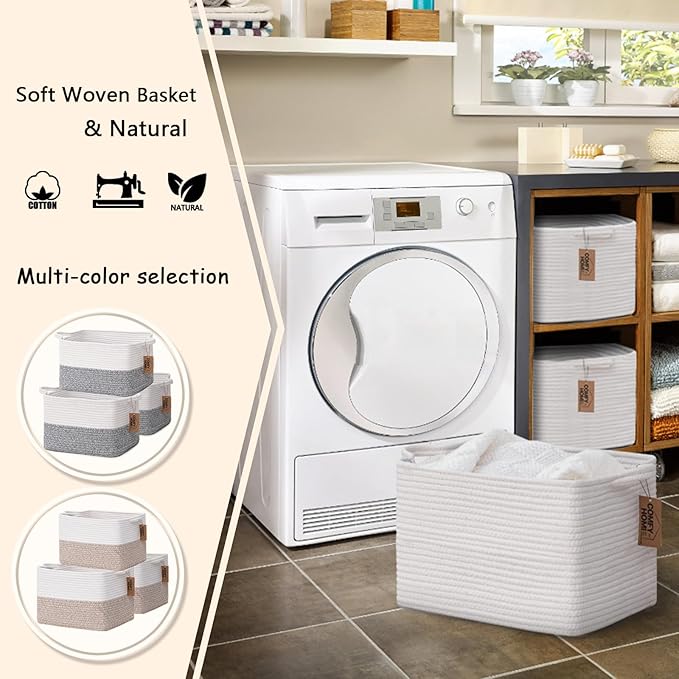 • MEDIUM BASKETS FOR ORGANIZING: 13.5''Lx11''Wx 9.5''H, Cotton rope baskets can be used in baby room, kid’s room, nursery, living room, bathroom, office. And are very ideal for storing books, toys, clothes,towels. It's a great way to store them out of sight
