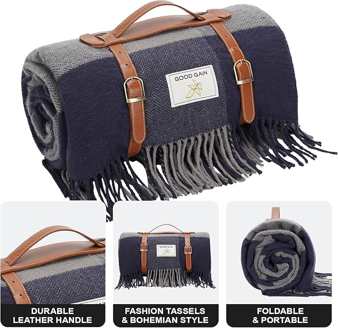 • PRACTICAL 2 in 1 Design- Our picnic mat is the perfect solution for picnics throughout the year. Our unique two-in-one design allows our Boho camping blanket to serve multiple purposes.Complete with a 100% acrylic body and PU leather handle, style, beauty, and practicality are seamlessly combined. We use tassels and unique herringbone lines as decoration to make the large picnic blanket extra special with multiple elements.the black bottom layer serves as a waterproof mat, providing protection a