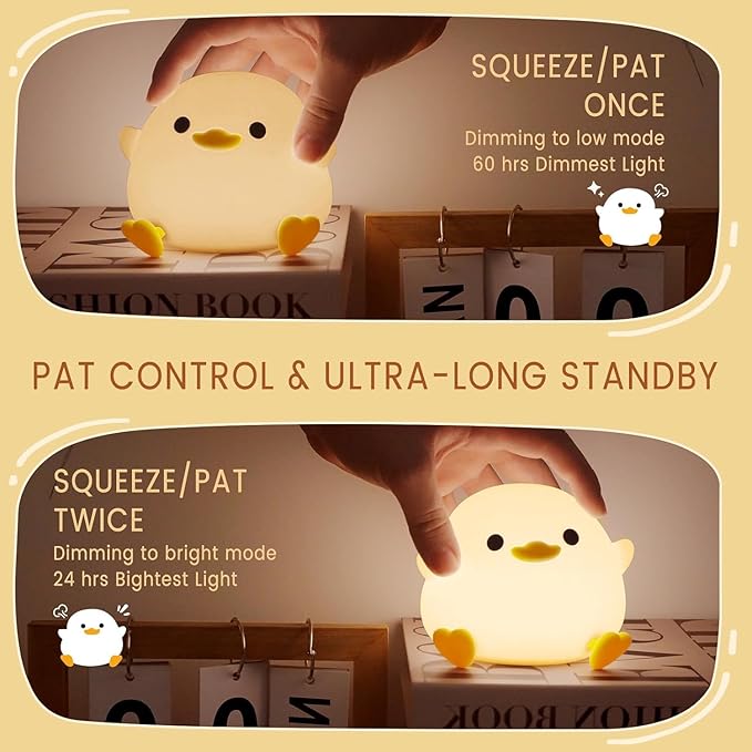 • ๐ƒ๐ข๐ฆ๐ฆ๐š๐›๐ฅ๐ž ๐ƒ๐ฎ๐œ๐ค ๐‚๐ฎ๐ญ๐ž ๐‹๐š๐ฆ๐ฉ๐ฌ: You can touch the lovely ducky night lights with 20 minutes timer choice, no need to manually shut it off. 2 levels different brightness settings: You can tap the dodo duck body to adjust the brightness of this cute lights in the weak and normal gear. Warm and soft lighting, let you sleep easily in a warm and cozy atmosphere. You can of course also use it during the day as a cute night light lamp or a decorative light for their room