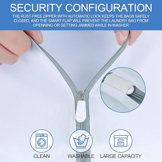 • The automatic locking zipper ensures that the zipper will not open during the washing process. Each laundry bag has an elastic zipper protector