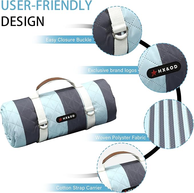 • ☀ 【Waterproof & Machine Washable】Outdoor picnic blanket is super easy to clean due to its durable and waterproof backing, easily shake & wipe off dirt, mud, wet grass, and beach sand. And you could put it into washing machine to save your time and free both hands.