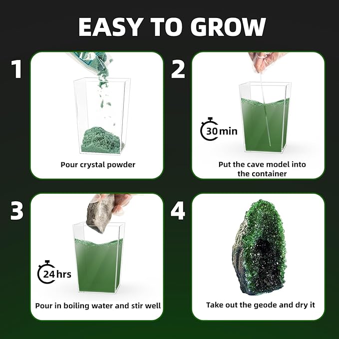 • 24-Hour Rapid Growth: The Gobidex Geodes growing kit can grow perfect crystals in just 24 hours, producing crystals larger; Kids can see their experiment results in a short time, it is not only amazing but also stimulates their curiosity