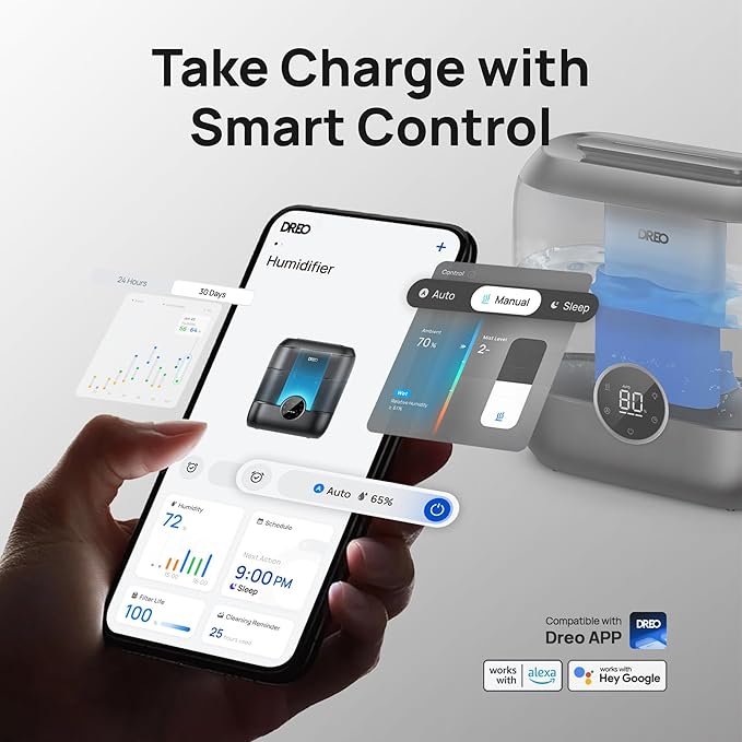 • ๐™ƒ๐™ช๐™ข๐™ž๐™™๐™ž๐™›๐™ฎ ๐˜พ๐™ค๐™ฃ๐™ฉ๐™ง๐™ค๐™ก, ๐™’๐™๐™š๐™ง๐™š๐™ซ๐™š๐™ง ๐™”๐™ค๐™ช ๐˜ผ๐™ง๐™š: Use the DREO app, voice commands, or Alexa to remotely manage your cool mist humidifiers for bedroom, Easily monitor indoor humidity and adjust settings to ensure a healthy environment for your family, especially suited for babies, pets and plants indoor.