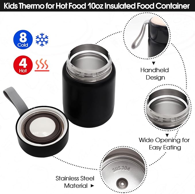 • 🖤 The food thermos measures 3.3 x 5.1 inches and the insulated food jar has a 10 oz capacity, big enough to hold your delicious soup or beverage. The insulated food jar is made of food-grade 304 stainless steel, which has good heat insulation and cold preservation properties.