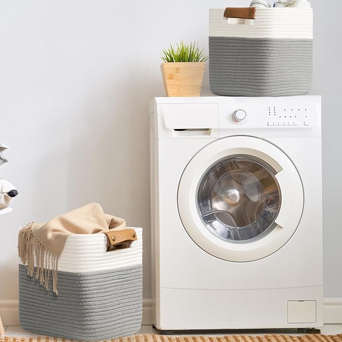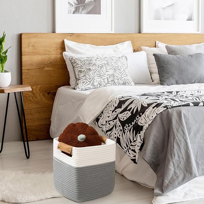 • Modern Charm: The storage baskets feature leather handles that provide comfortable grip for easy carrying. Woven storage bins are made of 100% cotton to ensure long lasting use. The contrast between the cotton and leather creates a stylish and modern look