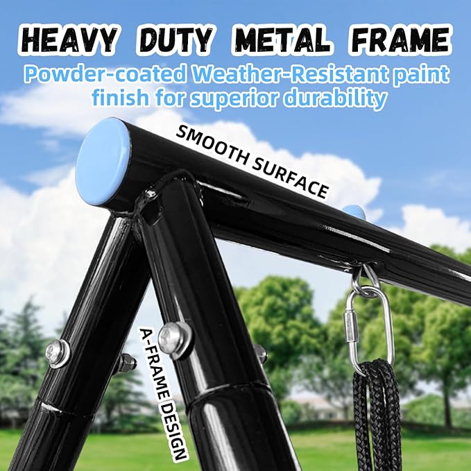• MILITARY-GRADE DURABILITY & STABILITY: Baby outdoor swing 1680D tear-resistant Oxford fabric , Engineered Stability System, A-frame + X-brace structure (1,000lbs static/660lbs dynamic load), toddler swing 72° triangular base