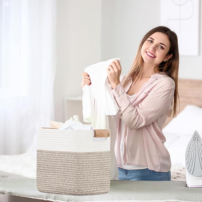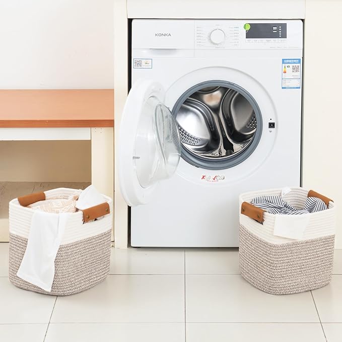 • Modern Charm: The leather handles of storage baskets for shelves provide comfortable grip for easy carrying. Woven storage bins are made of 100% cotton to ensure long lasting use. The contrast between them creates a stylish and modern look