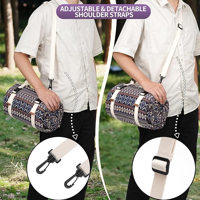• ADJUSTABLE SHOULDER STRAPS - The portable picnic blanket can be carried easily by hand, on either shoulder by adjusting to the proper lengths, so you can carry other picnic suppliers with the other hand,the handle strap with double ring buckle is convenient to carry, and can easily fold and fix the picnic mat,so if you don't fold it exactly as originally packed, it will fit anyway,saving a lot of space on the travel.