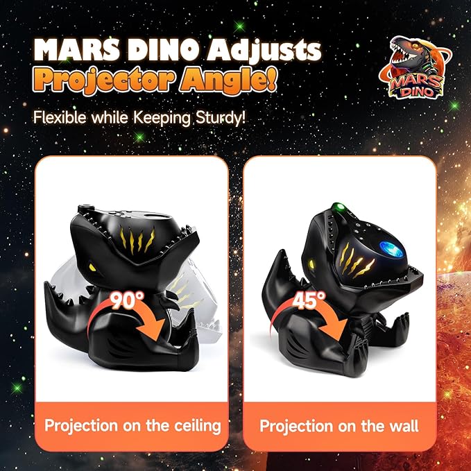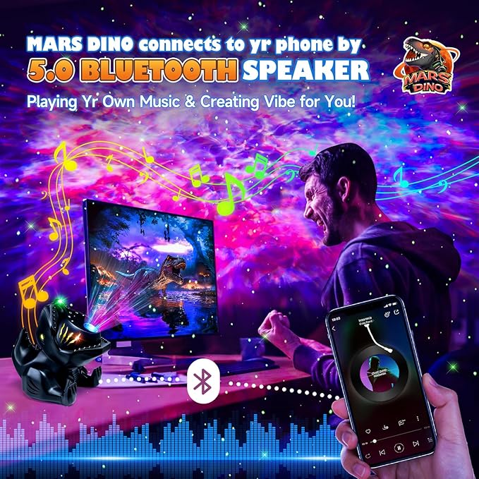 • HiFi BLUETOOTH SPEAKER STAR PROJECTOR: This star projector dinosaur projector light for kids can not only emit brilliant galaxy light, it can sing too! The dinosaur bedroom decor has been updated with 5.3 version HIFI BLUETOOTH SPEAKER. The dinosaur bedroom decor can connect to yr phone & play yr own music. The sound quality is great! the star projector allowing u to relax with soothing music and star lights galaxy light. u'll be amazed to see stars twinkle and nebulae move rhythmically to the beat of the music,creating a more fun and energetic party atmosphere. The dinosaur bedroom decor,ceiling projector lights for bedroom star projector is wonderful mood lighting, dinosaur bedroom decor!