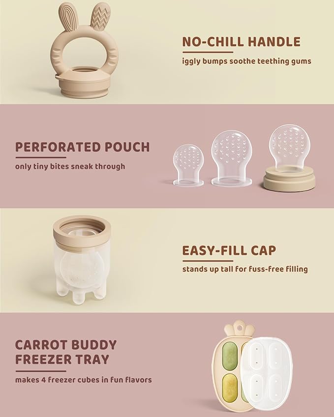 • 【100% Food Grade Silicone】The complete freeze-n-feed teether combo is made of BPA free silicone with no small parts to provide a pleasant feeding experience. Our feeder set exceeds all government safety regulations and standards for parents' peace of mind.