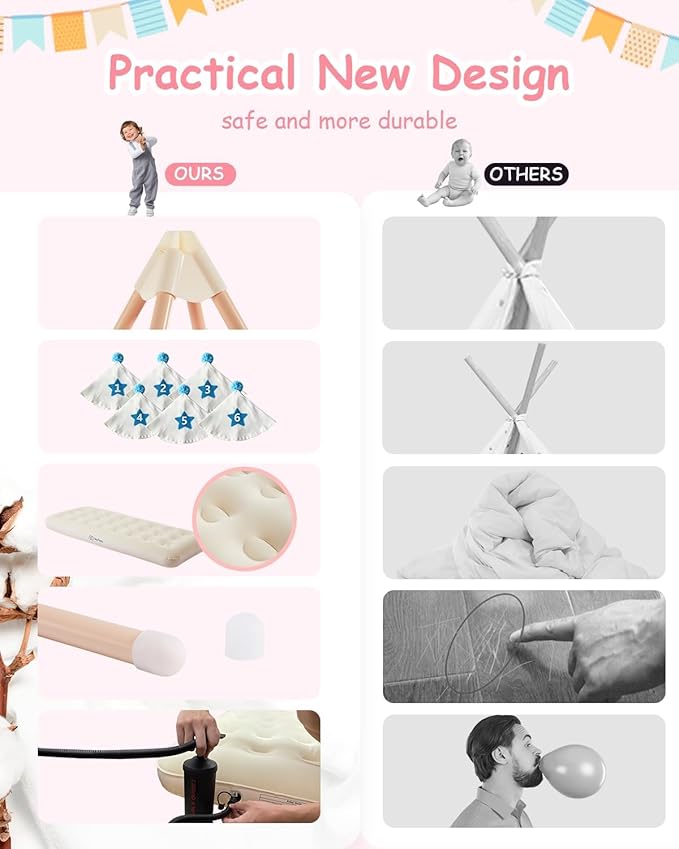 6 Pack Teepee Tent for Kids with Inflatable Airbed, Light, Toddler Tent Children Room Tents, Slumber Party Sleepover Tents, Indoor Outdoor Kids Playtent Playhouse for Girls & Boys