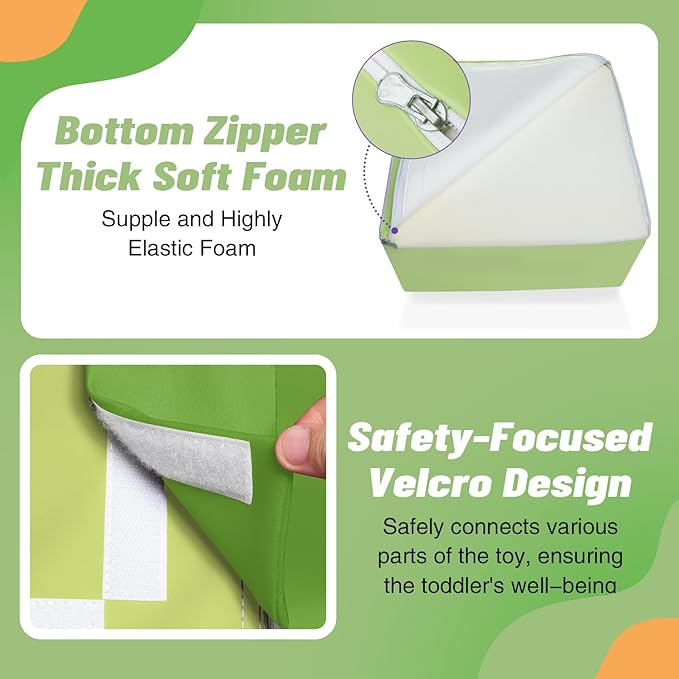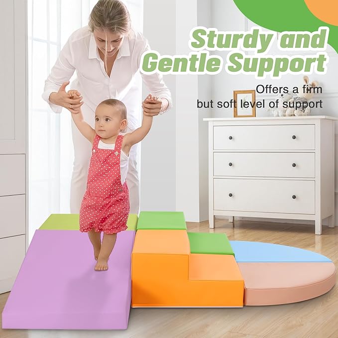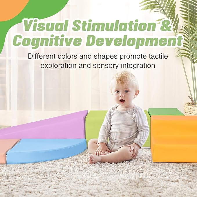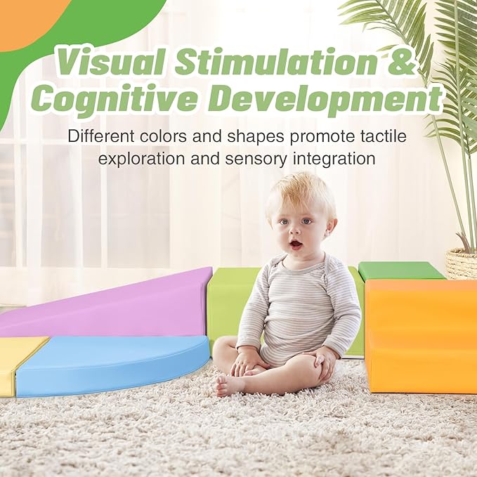 • 6-Piece Set: Baby climbing blocks consists of 1 yellow half-moon, 1 blue half-moon,1 orange stair, 1 green stair, 1 grass green square and 1 purple slide. This soft play equipment stimulates your child's imagination to create endless combinations of structures, allowing them to enjoy the fun of the toy as they climb up and down, stacking and swapping four different shapes. Our climbing sets have a unique patented design that your child is sure to love