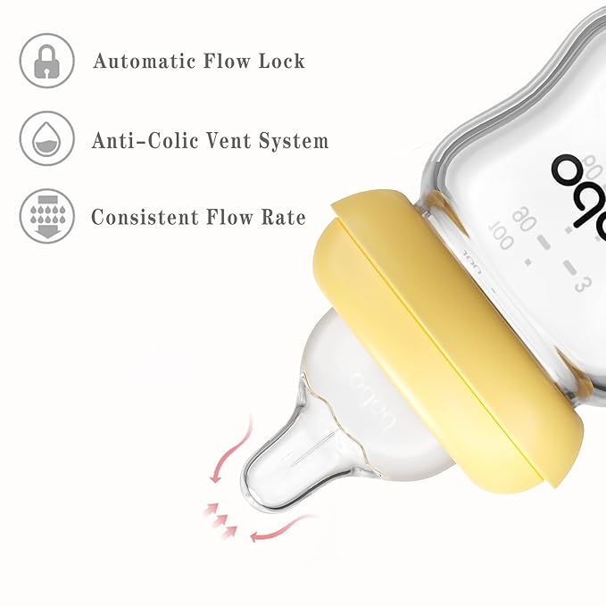 YOHKOH Natural Glass Baby Bottle with Natural Response Nipple, Newborn Anti-Colic Baby Bottles, Wide Neck Mushroom Cap Baby Bottle, Clear (Yellow, 3.4oz (Pack of 2))