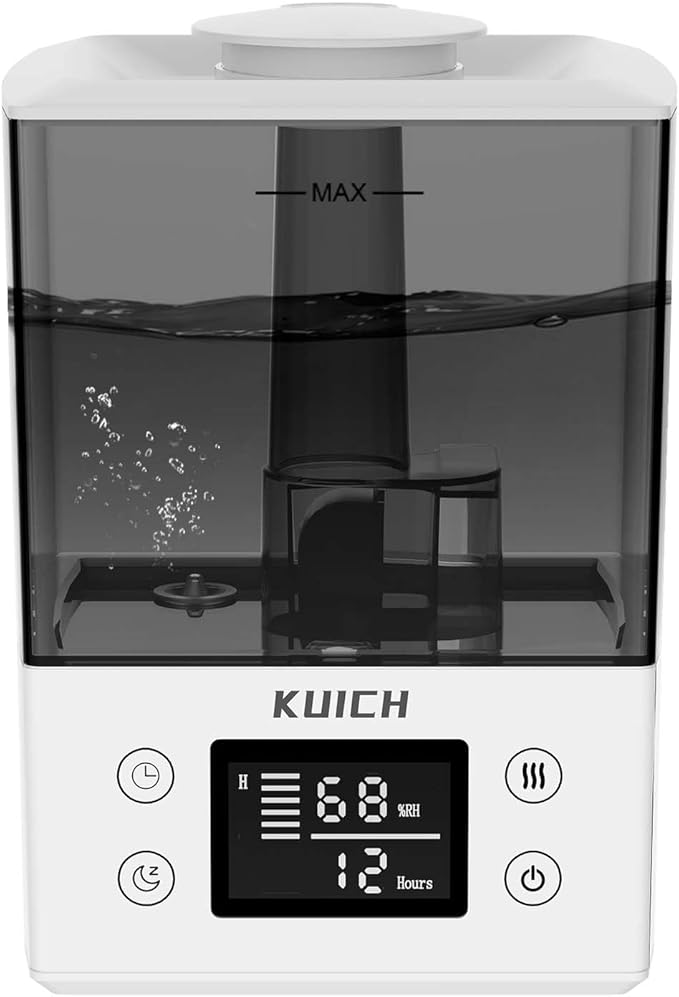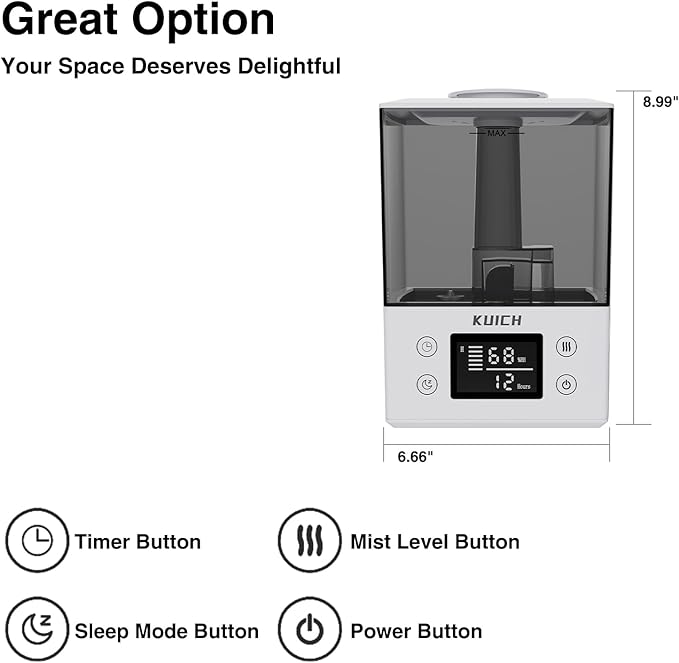 • 【Compact 2.4L Water Tank】- This ultrasonic cool mist humidifier employs a higher frequency ultrasonic misting technology with an oscillation frequency of up to 2.4MHz. That in a finer and more delicate cool mist with improved diffusion. Effectively regulating air humidity, it operates continuously for up to 25 hours in rooms not exceeding 180 square feet. Maintain a stable and healthy environment, bid farewell to sleep disruptions caused by nasal congestion, coughing, or dry mouth. Ideal for bedrooms, nurseries, offices, and indoor plants.