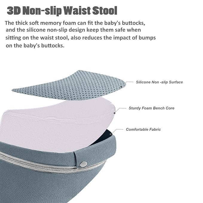 • Ergonomic Hip Seat: The waist stool maintains the baby's M-shape during carrying, helping their skeletal development. The wide waistband make the hip seat to fit snugly against the parent's waist, helping to share the weight during carrying baby. The inward sloping angle of the hip seat keeps the baby close to the parent's body comfortably and reduces bumps and shaking when parents walking. Besides, it make baby feel safety in their arms.