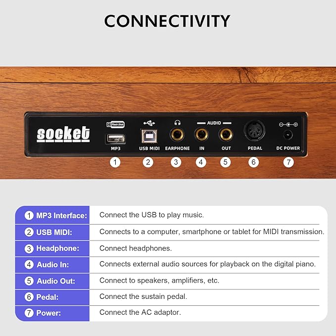 88 Key Digital Piano Keyboard for Beginners,Full Size Electric Piano Semi-Weighted Keyboard with Sheet Music Stand,Pedal,Headphone,Power Adapter,USB-MIDI Compatibility,Wood Grain Brown