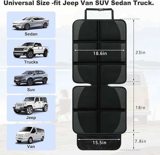 • The whole dimension of the auto seat protector carseat is 18.6 x 48.8 inch, the seat: 18 x 18.6 inch, the back: 23 x 18.6 inch, and the mesh pocket: 15.5 x 7.8 inch. Universal fit Jeep Van SUV Truck