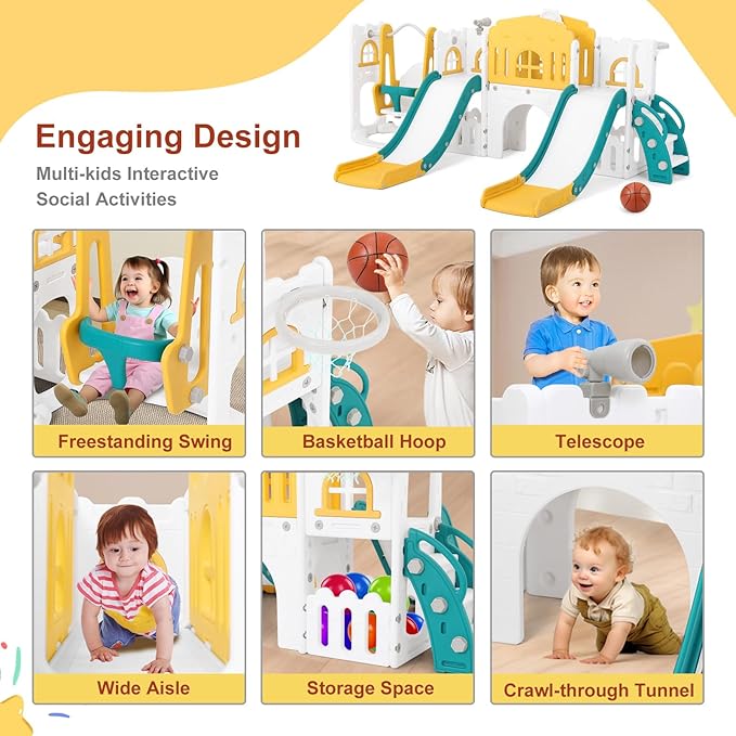 • 【10-in-1 Multifunctional Playset】JOYLDIAS 10 in 1 toddler slide set has 10 activity areas, including double 2 slides, basketball hoop, storage space and non-slip enclosed step, widened climbing ladder, crawl-through tunnel and telescope. It can exercise children's muscle strength, balance and coordination and make the reaction more agile. And add baby's fun during the play.