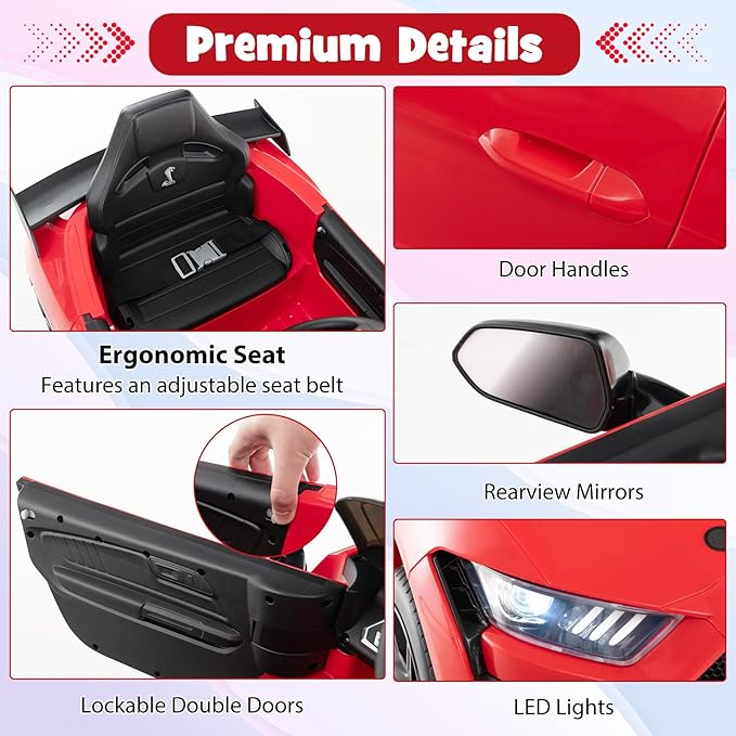 Costzon Ride on Car, 12V Licensed Ford Mustang Shelby GT500 Kids' Electric Vehicles w/Remote Control, USB Port, Radio, Music, Player, High Low Speed & Soft Start, Racing Kids Car for Toddlers (Red)