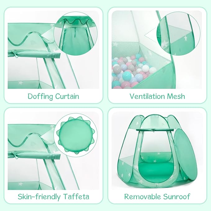 • [50 Balls Included]: This kids play tent comes with 50 bright colored balls. Our toys for 1 2 3 year old girl has passed strict product tests and USA Toy Safety Guidelines. This 1 year old girl gift is a dreamlike playhouse, The ball pit tent features LED star string light, mesh windows, removable sunroof, crawling door with roller curtain, and anti-scratch-designed velcro. Which is very for kids' use and improves children's imagination, creativity, practical ability.