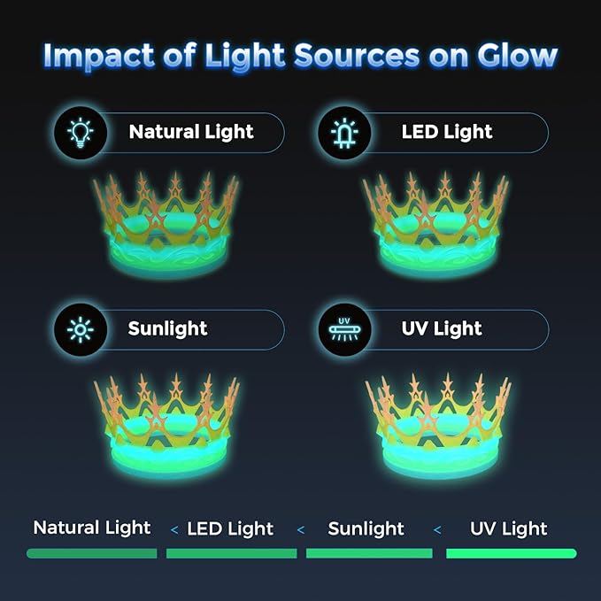 • Exceptional Glow Effect - This glow-in-the-dark PLA absorbs light and emits a soft glow in the dark. The brightness lasts for up to 5-100 minutes, with a 310% enhancement in brightness compared to standard glow-in-the-dark materials, providing a brighter and longer-lasting glow.
