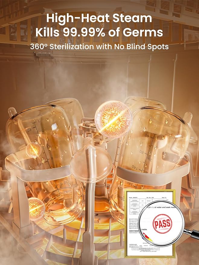 • 𝐄𝐟𝐟𝐢𝐜𝐢𝐞𝐧𝐭 𝐒𝐭𝐞𝐫𝐢𝐥𝐢𝐳𝐚𝐭𝐢𝐨𝐧 𝐚𝐧𝐝 𝐃𝐫𝐲𝐢𝐧𝐠: The 212°F high-temperature steam kills 99.99% of germs effectively, the subsequent hot air drying ensures bottles are spotless and ready for immediate use. This baby bottle sterilizer and dryer provides a hygienic environment for your baby.
