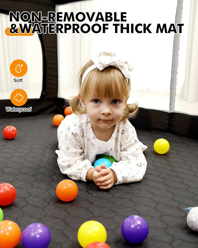 • Non-Removable Thick & Waterproof Mat:The playpen features a non-removable thick mat that provides a soft and comfortable surface for your baby; the waterproof material allows for easy cleanup of spills, making it ideal for both indoor and outdoor use