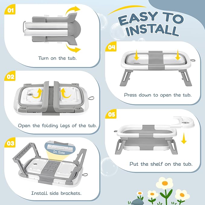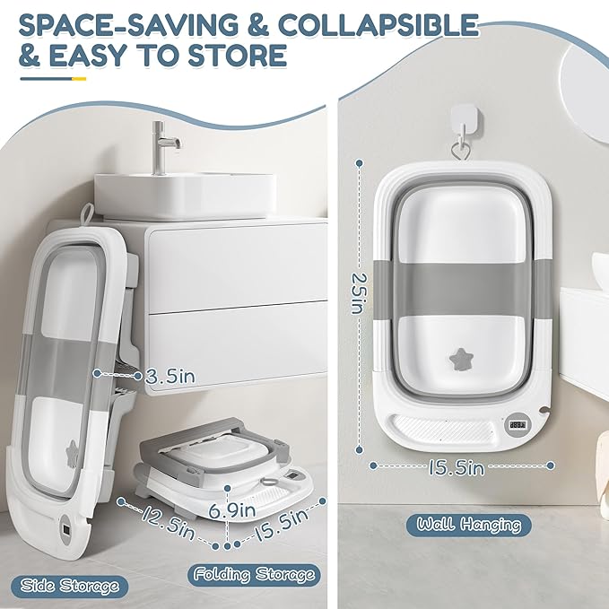 • COLLAPSIBLE & SPACE-SAVING DESIGN: This baby bathtub easily folds into a compact square, with a thickness of less than 4 inches. Perfect for storage in the bathroom or car trunk, making it an ideal companion for home and travel.
