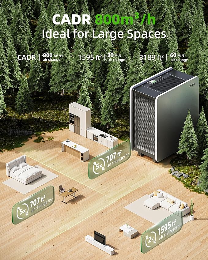• CADR 930m³/h Ideal for Large Spaces:Turn on this efficient air purifier, and in just 30 minutes, it can rejuvenate a space of 2062 sq ft, and purify an area up to 4125 sq ft within 1 hour. Its snail shell design gives it powerful wind force, with a CADR 930m³/h. Whether for home or office use, it can quickly provide pure air, making your living environment safer and more comfortable.